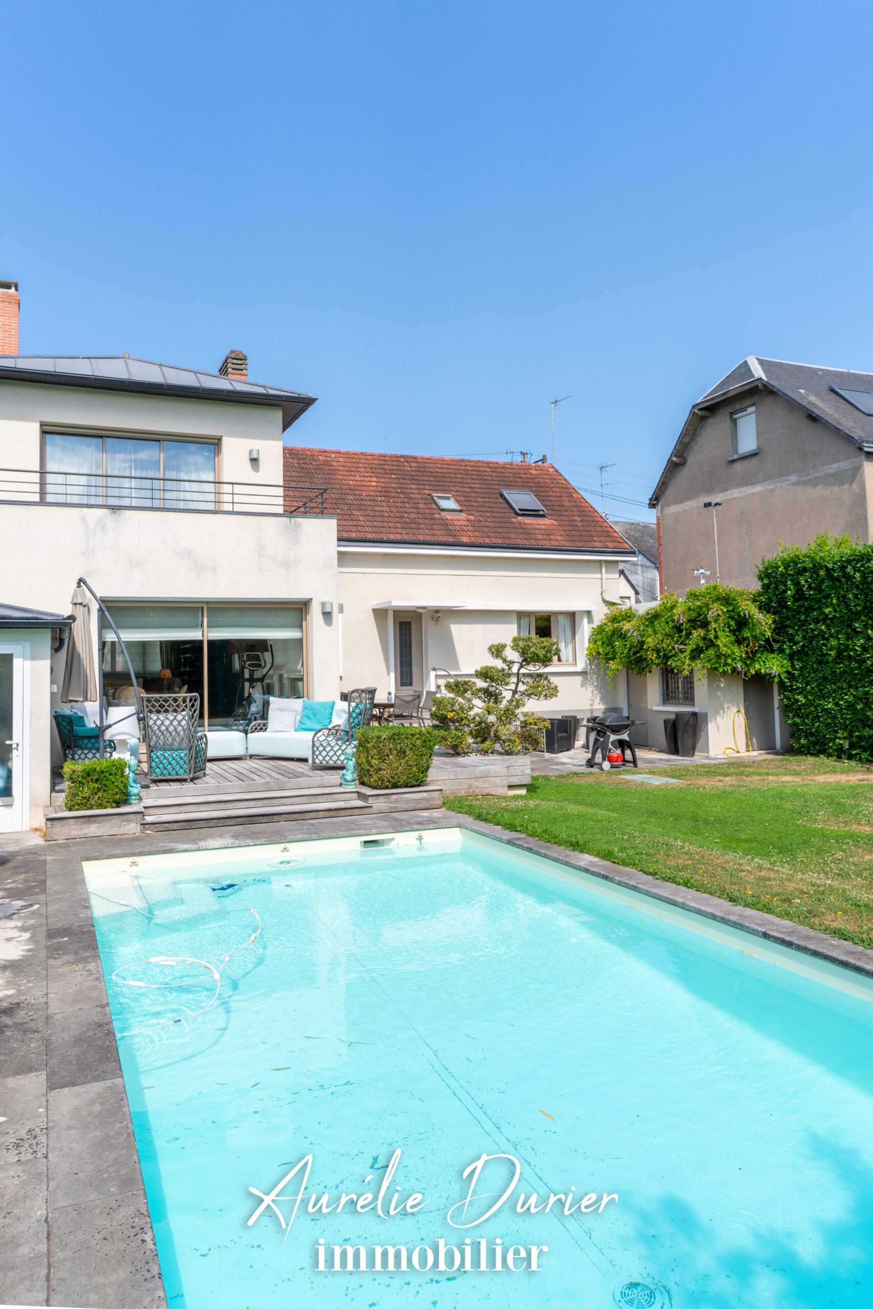 Le sous-sol, entièrement chauffé, abrite une buanderie, un espace lingerie, un local technique ainsi qu’une cave à vins climatisée. À l’extérieur, la maison se prolonge sur une terrasse en bois et un jardin intimiste de 540 m². Une piscine chauffée et nage à contre-courant, invite à la détente dans un cadre soigné et sans vis-à-vis.