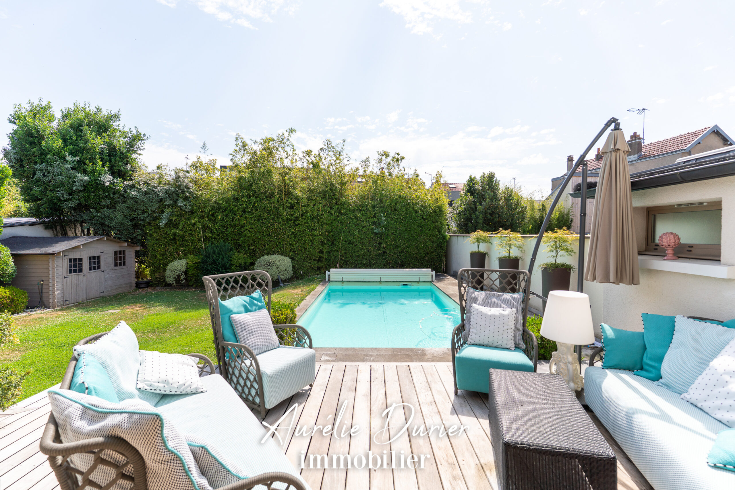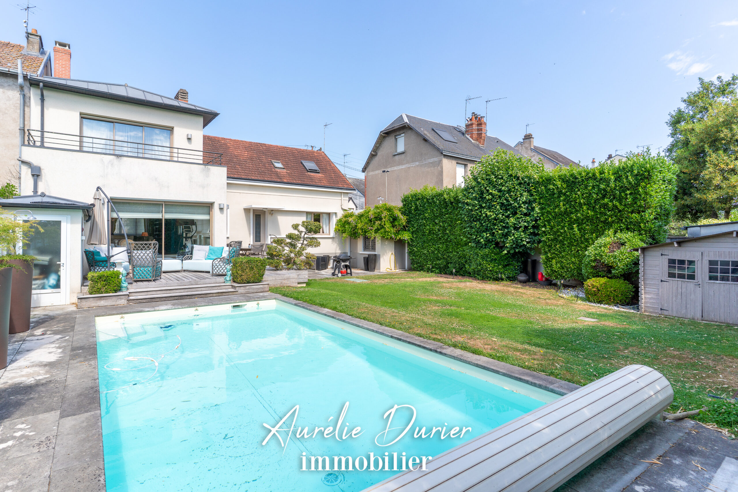 Le sous-sol, entièrement chauffé, abrite une buanderie, un espace lingerie, un local technique ainsi qu’une cave à vins climatisée. À l’extérieur, la maison se prolonge sur une terrasse en bois et un jardin intimiste de 540 m². Une piscine chauffée et nage à contre-courant, invite à la détente dans un cadre soigné et sans vis-à-vis.