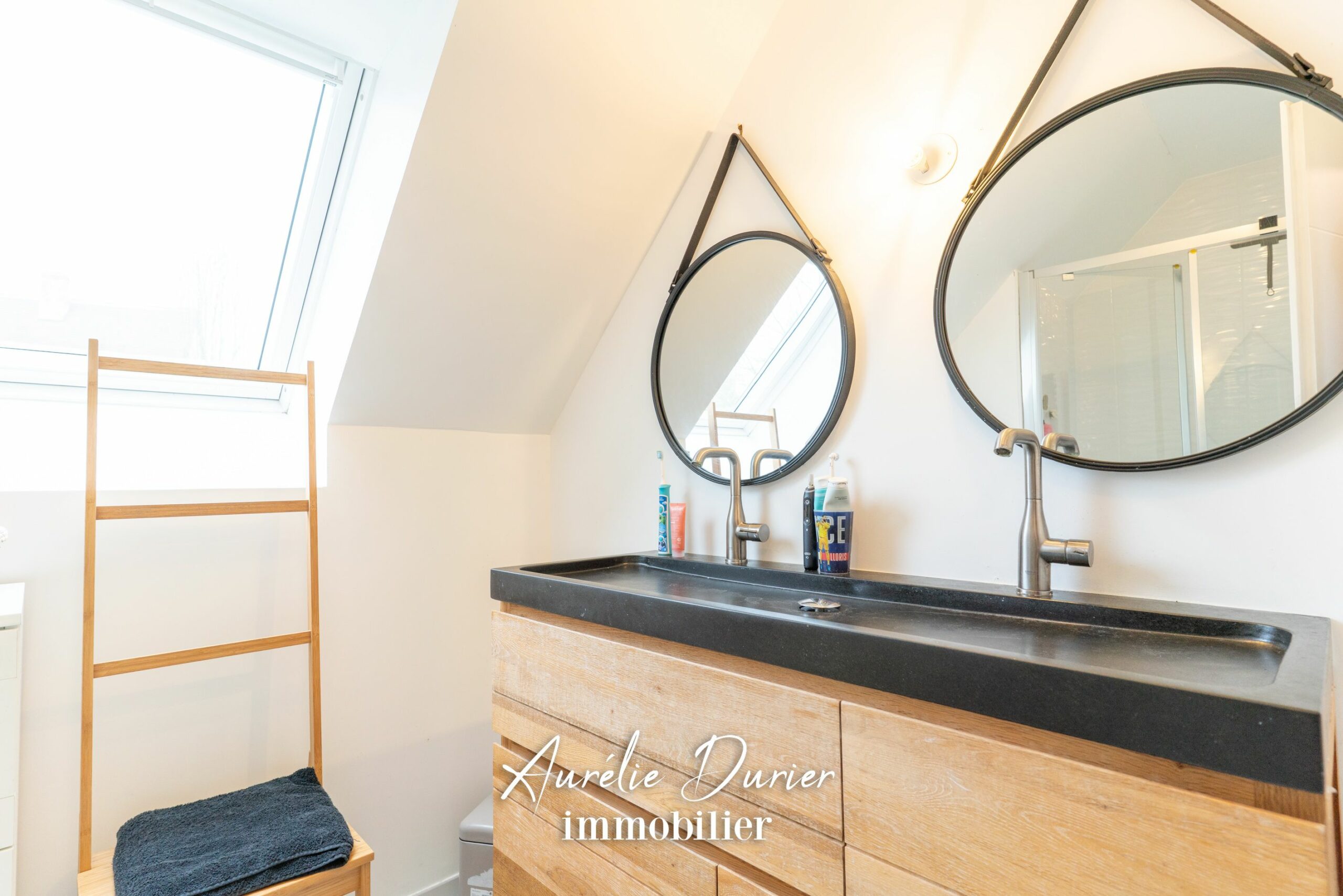 À l’étage, le palier dessert trois très belles chambres aux volumes généreux, chacune dotée de son espace dressing. Une salle d’eau avec double vasque, un WC indépendant et de nombreux rangements dans le couloir complètent cet espace nuit parfaitement agencé.