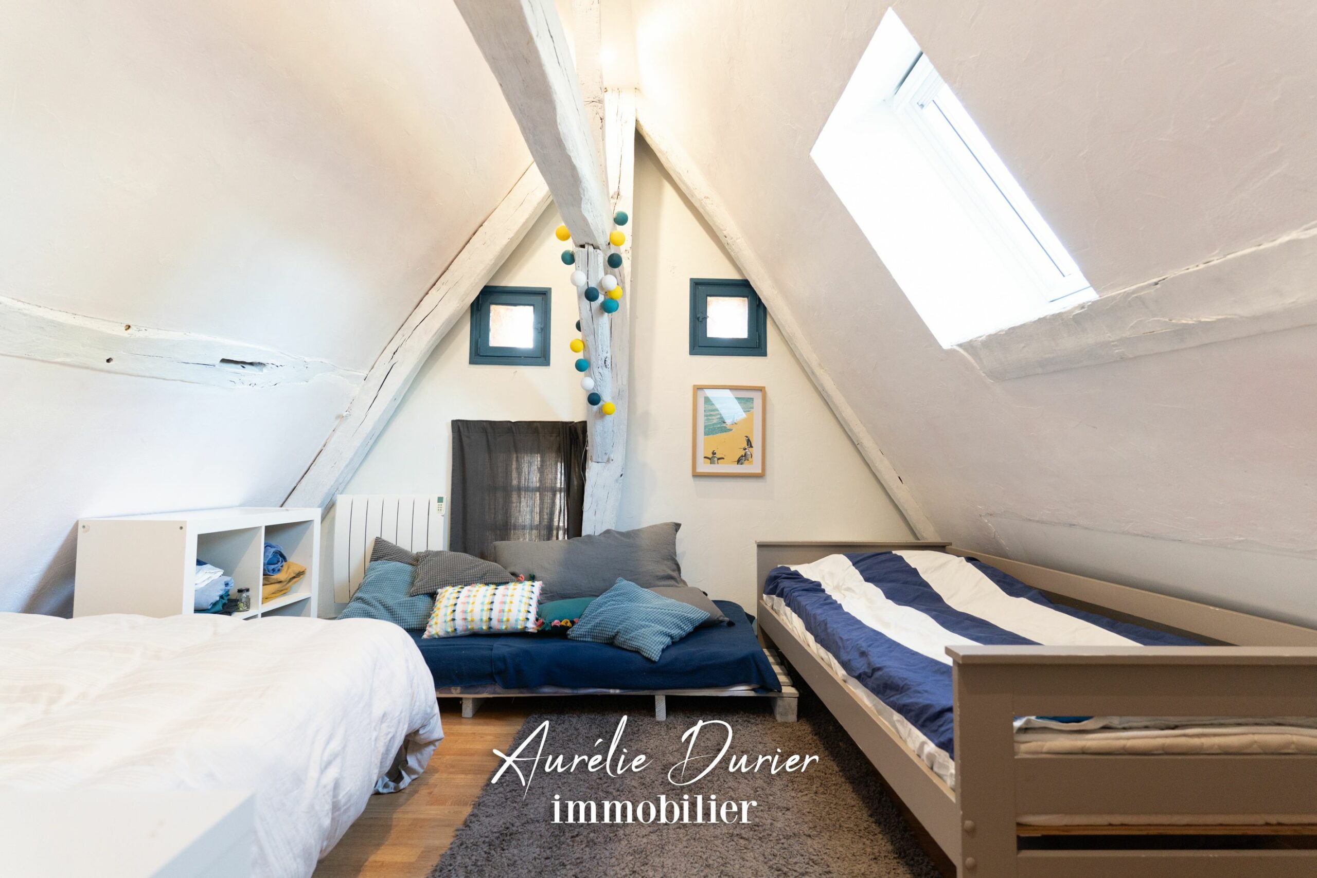 À l’étage, sous une magnifique charpente apparente se déploient trois chambres supplémentaires, une salle d’eau avec WC et de nombreux rangements offrant tout le confort nécessaire à la vie de famille.