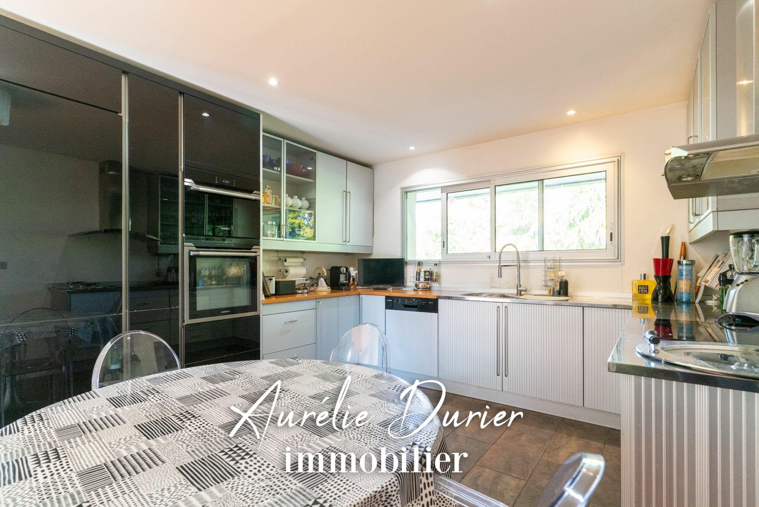 La pièce de vie de près de 100 m² allie lumière, élégance et convivialité : un vaste salon sublimé par un puit de lumière, un parquet massif, une cheminée et une cuisine d’origine parfaitement entretenue. Chaque espace a été conçu pour offrir une vue dégagée sur le jardin arboré créant une atmosphère harmonieuse et apaisante.