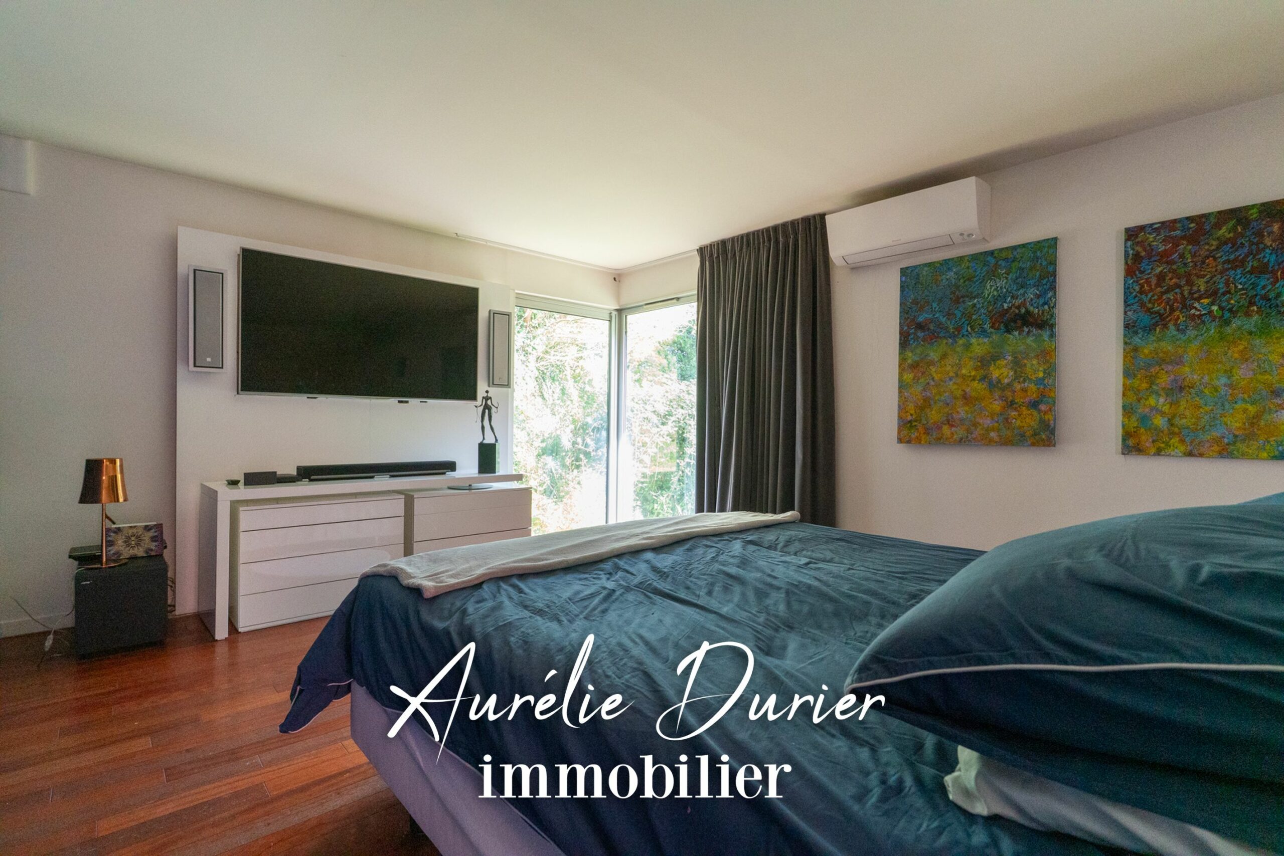À l’extérieur, le jardin clos et paysagé de 5 000 m² accueille une vaste piscine chauffée et sécurisée.