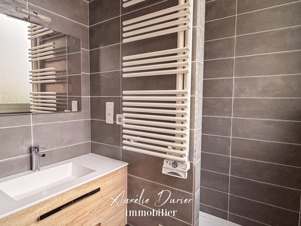 La salle d’eau indépendante propose une large douche à l’italienne, un meuble vasque ainsi qu’un grand sèche-serviettes.